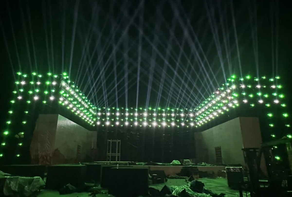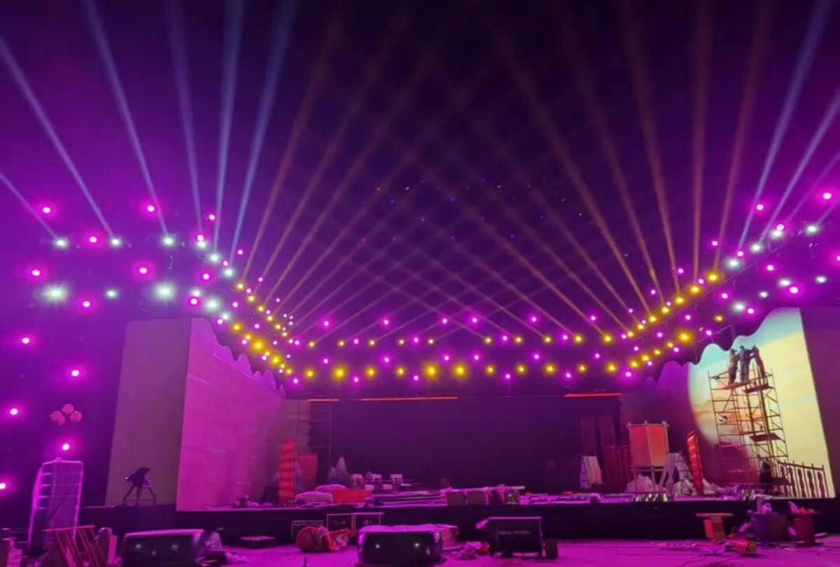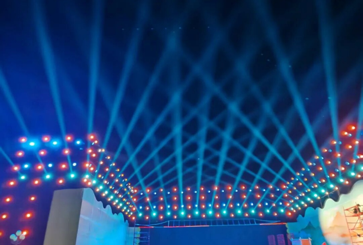 而這場文化盛宴的舞臺光彩,全由新疆大唐盛業聯合歐瑪燈光打造——近500臺歐瑪旗艦設備強勢助陣,其中防水光束燈以精準銳利的光效劃破邊疆夜色,切割燈靈活勾勒出詩與舞臺的立體輪廓,LED染色燈則將“戈壁明珠”的璀璨與軍墾情懷的厚重鋪滿全場,讓千年詩韻與兵團精神在光影流轉中實現深度交融。